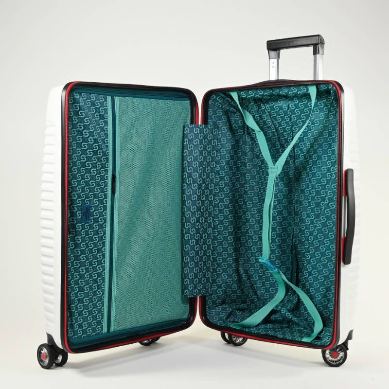 DUBAI Maleta spinner grande 28 blanca, inspirada en la moderna ciudad de Emiratos Arabes y uno de sus edificios más simbólicos.
