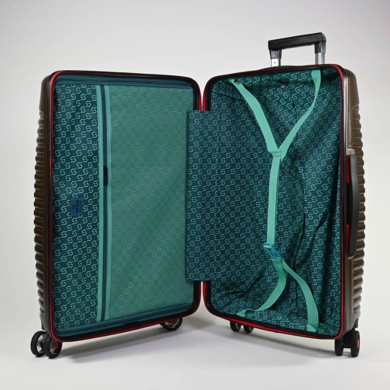DUBAI Maleta spinner grande 28 marrón, inspirada en la moderna ciudad de Emiratos Arabes y uno de sus edificios más simbólicos.