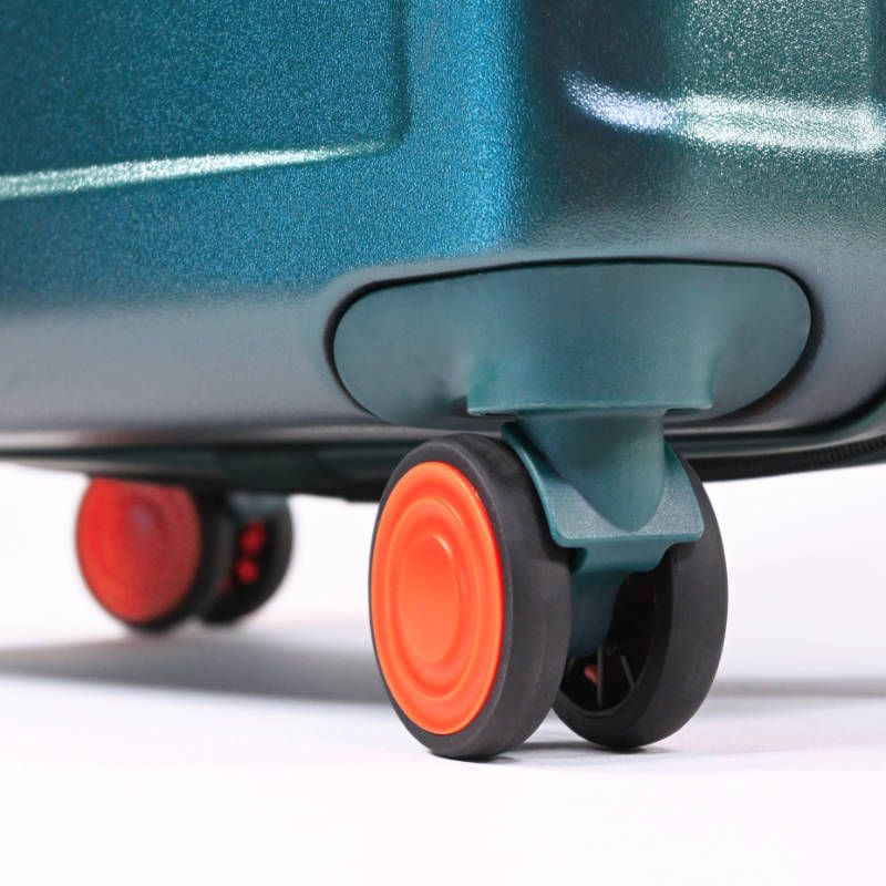 La cremallera y los detalles de los accesorios, como ruedas y asas vienen en el color naranja.