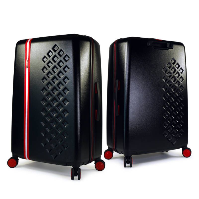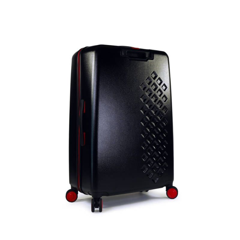La cremallera y los detalles de los accesorios, como ruedas y asas vienen en el color secundario, rojo.