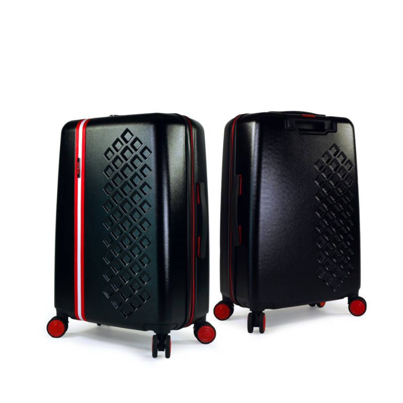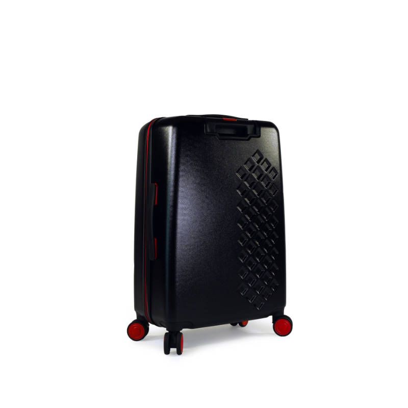 La cremallera y los detalles de los accesorios, como ruedas y asas vienen en el color secundario, rojo.